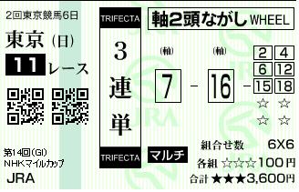 それを見てスイープトウショウ 1着固定で2,3着は知らぬなりに考えてみてアドマイヤグルーブ、オースミハルカ、エアメサイア、ヤマニンアラバスタの三連単100円 × 12点 1200円分の馬券を購入☆